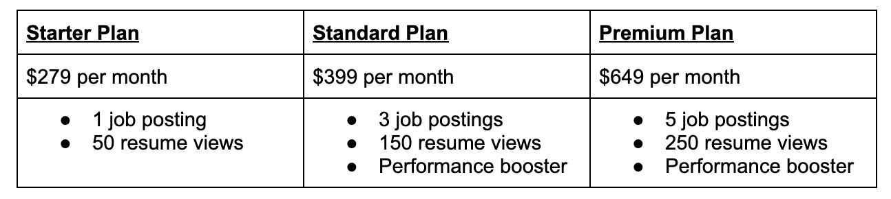Monthly plans range from $219-$599 and include 500 resume views and one, three, or five job postings. If you want to add on other services, CareerBuilder can generate a custom quote for you.